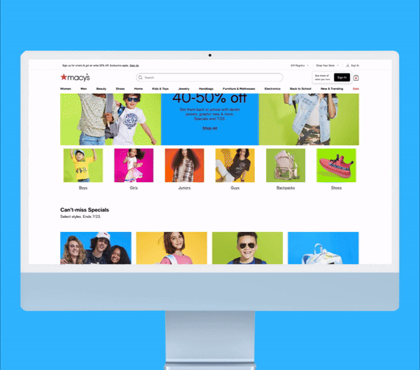Macy’s back-to-school campaign showcases a vibrant mix of individuals with different abilities. It's filled with energy and excitement, highlighted by lively photography and bold background colors. The campaign prominently features the Own Your Style™ branding.