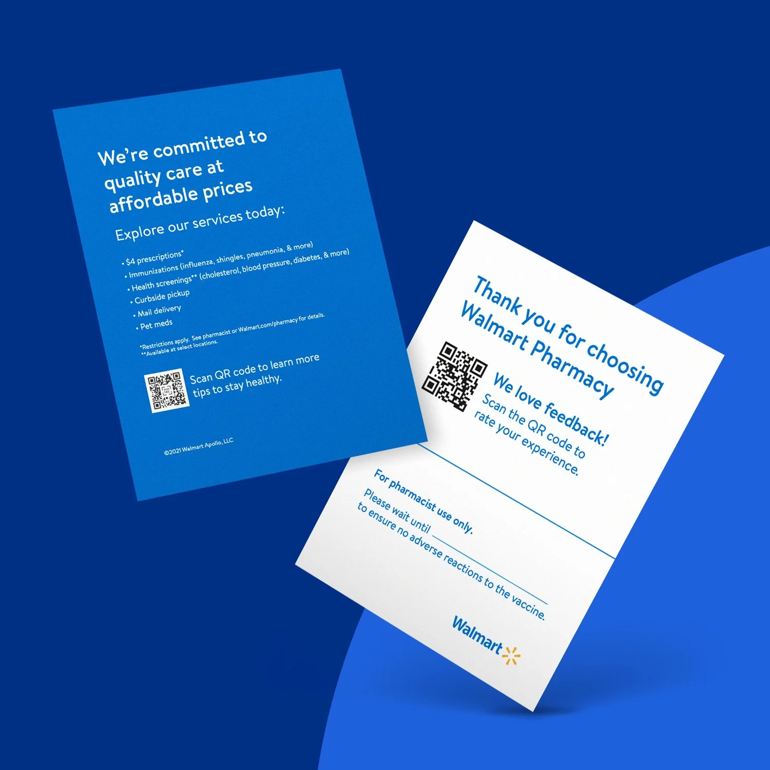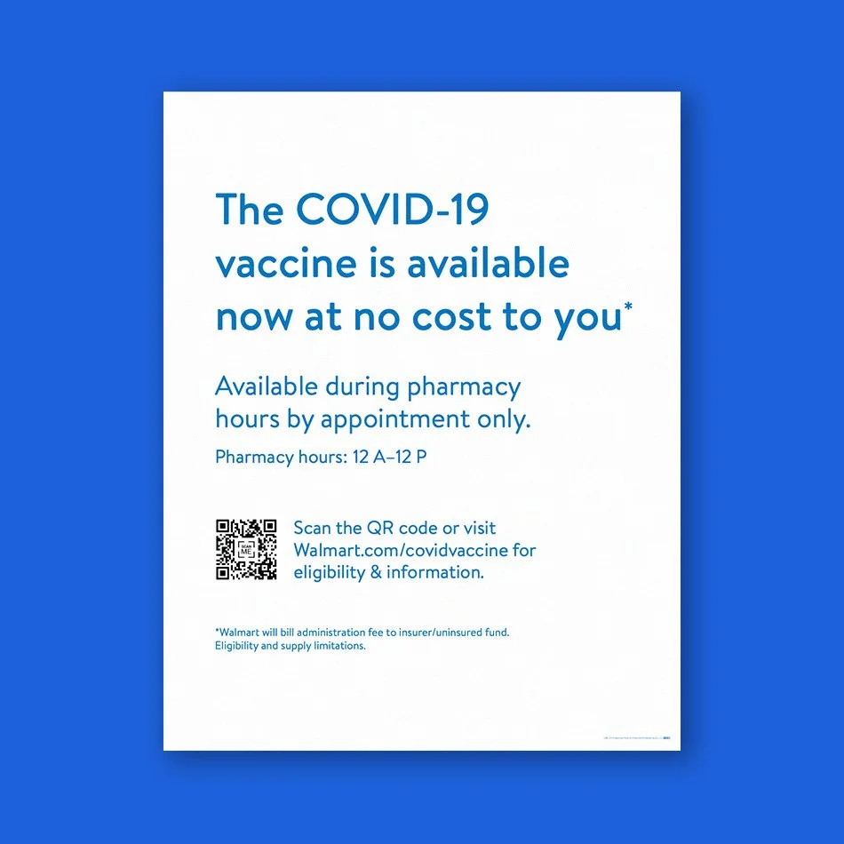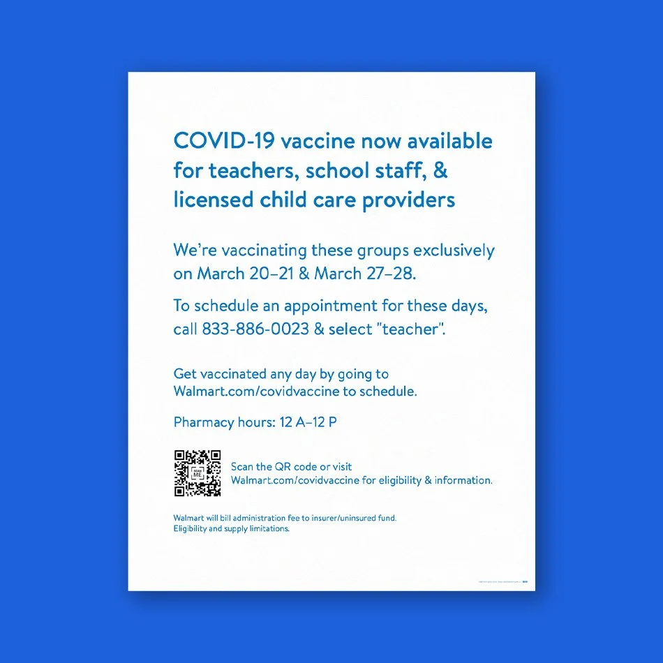 In 2021, I collaborated with a lean, multidisciplinary team of copywriters, marketers, and project managers to spearhead a nationwide signage and collateral rollout. Our mission was to transform Walmart and Sam’s Club pharmacies into accessible vaccination hubs for 150 million weekly shoppers.
